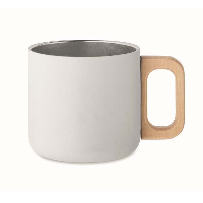 Duplafalú bögre újrahasznosított rozsdamentes acélból (90% újrahasznosított rozsdamentes acél és 10% rozsdamentes acél), fa fogantyúval. Űrtartalom: 350 ml.