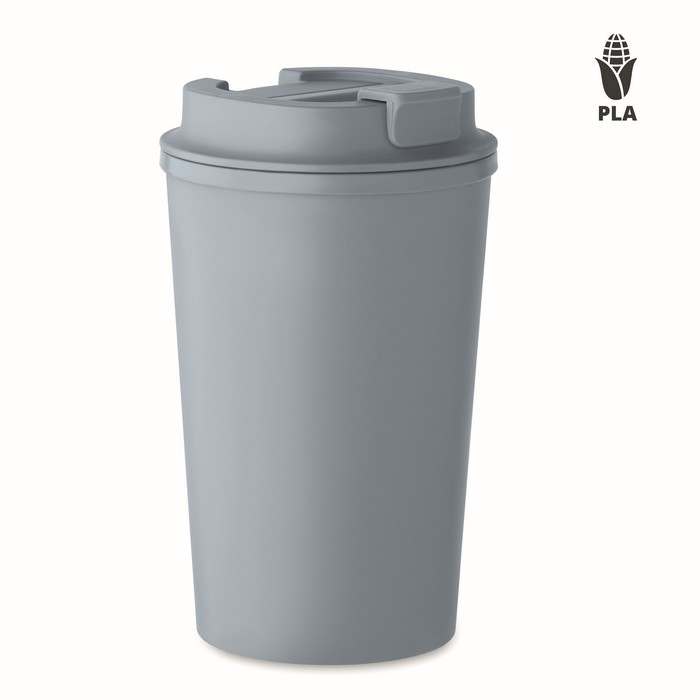 Duplafalú pohár 100% kukorica PLA-ból, PP, belül TPR ivófedéllel. Szivárgásmentes. Űrtartalom: 350 ml.