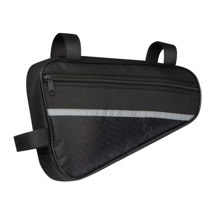Kerékpártáska tartós 600D poliészterből, fényvisszaverő csíkokkal. A táska könnyen rögzíthető a középső váztartóra a konzolok segítségével, és elegendő helyet biztosít minden fontos tárgynak.