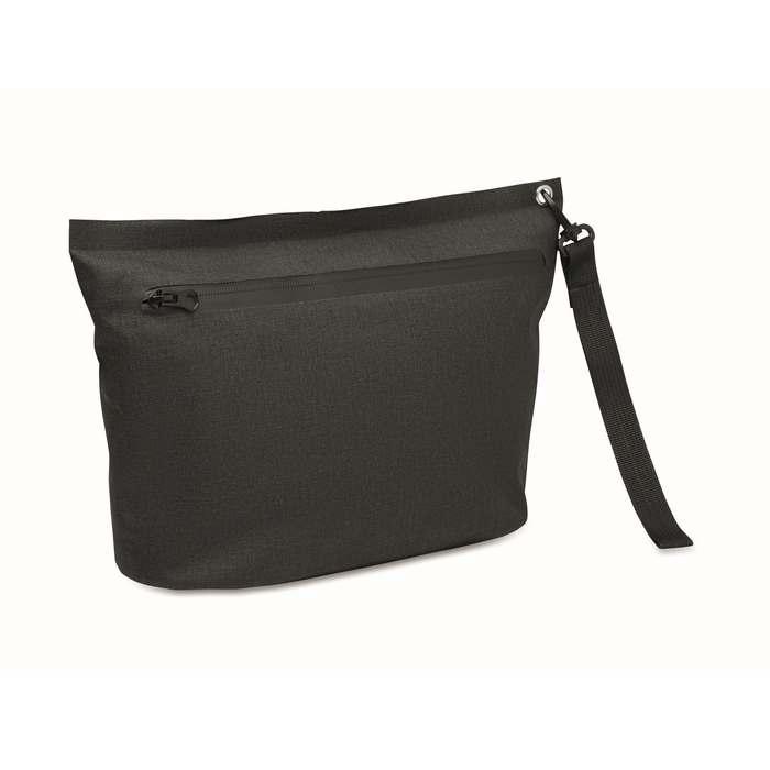 Táska személyes tárgyak vagy dokumentumok tárolására, 300D RPET anyagból, PVC bevonattal, csuklópánttal. Vízlepergető anyag.
