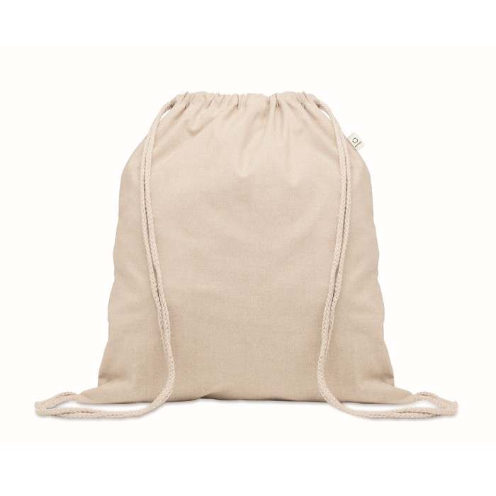 Húzózsinóros táska 30% fogyasztás előtti újrahasznosított pamutból és 30% RPET-ből. 140 g/m². Ez az anyag nyomtatás után zsugorodhat.