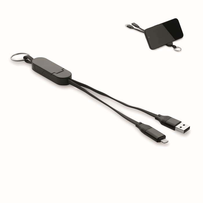 60 W-os kábel újrahasznosított ABS házban, kulcstartóval és telefonállvánnyal. Bemenet: 2 az 1-ben C-típusú és USB-A. Kimenet: C-típusú és mikro-B (2 az 1-ben). Kábel hossza: 26 cm.