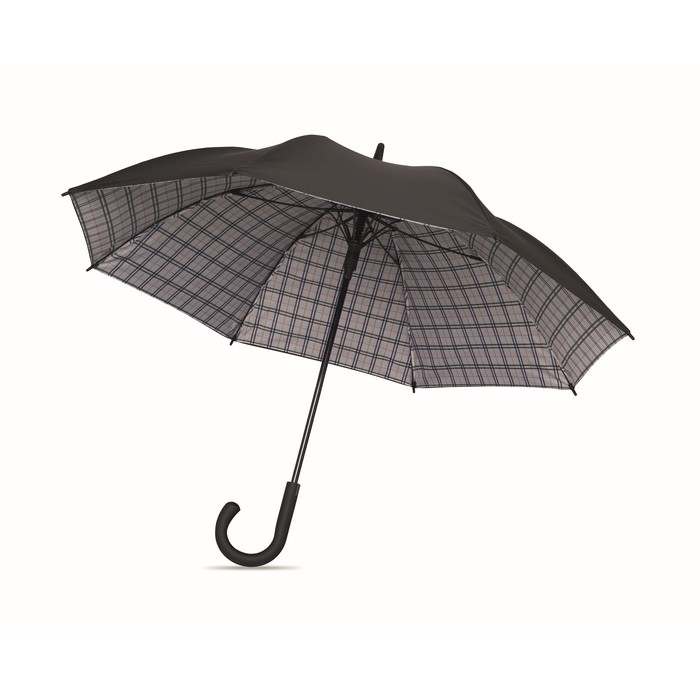23 colos, automatikus nyitású, szélálló esernyő 190T pongee nyersselyem anyagból, a belső oldalán kockás mintával. Üvegszálas váz, fekete bevonatos rúd és műanyag cikkelyzáró elemek. Hajlított, gumírozott markolat. Manuális záródás.