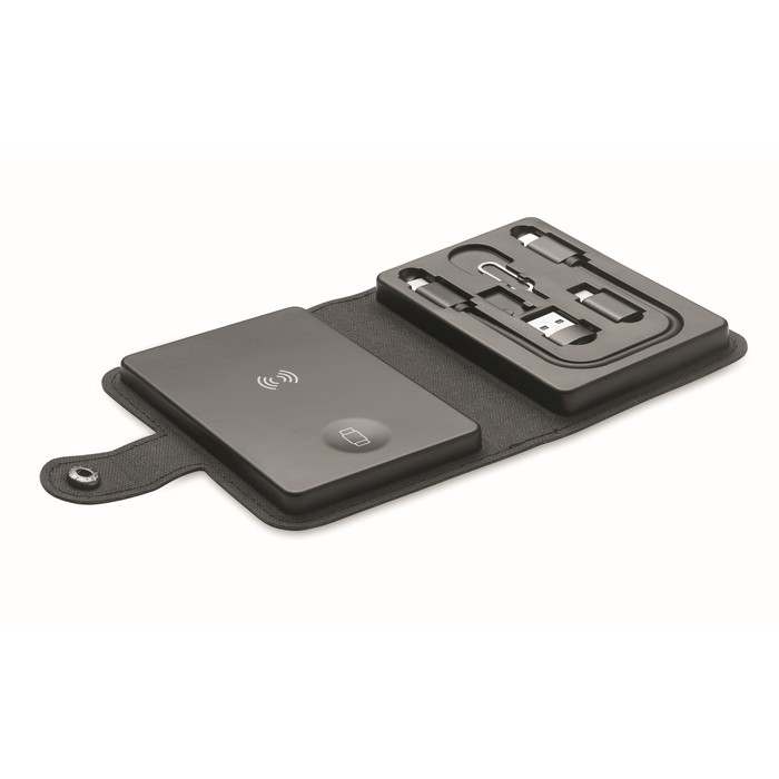 Kábelcsatlakozó készlet 15 W-os vezeték nélküli töltővel, okosóra töltővel (csak Apple®). 4 az 1-ben töltőkábel, SIM kártya kiszedő tű. Újrahasznosított PU + RPET borítás, újrahasznosított ABS műanyag és újrahasznosított alumínium lemez a fedlapon.