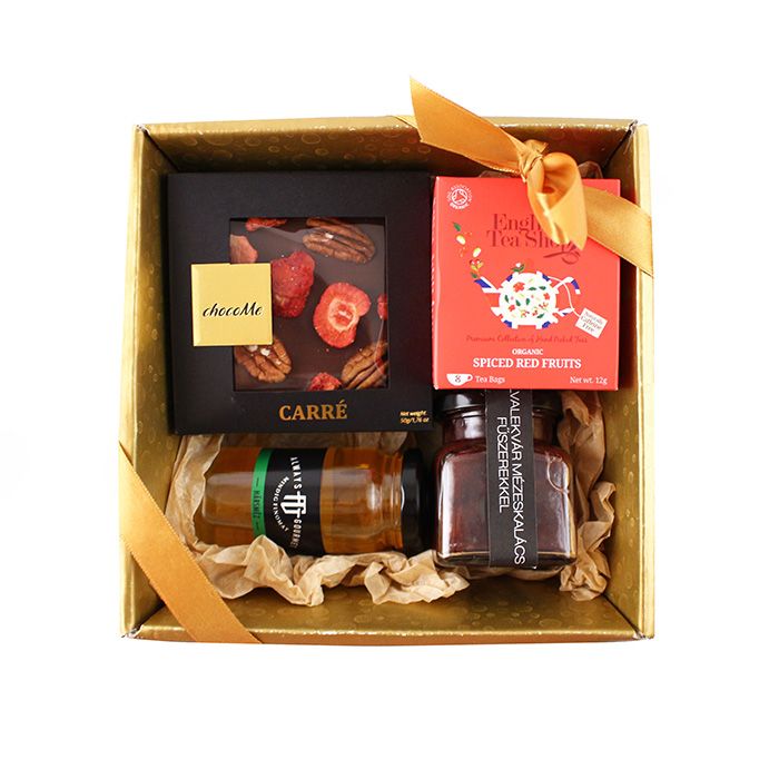 Bio Tea 8 db filterrel (English Tea Shop), 120 ml szilvalekvár mézeskalács fűszerekkel, 50 gr méz, 50 g exkluzív táblás tejcsokoládé pekándióval és eperszelettel, arany átlátszó tetős díszdobozban masnival (alul: 170x170x80mm, felül: 200x200x80mm).