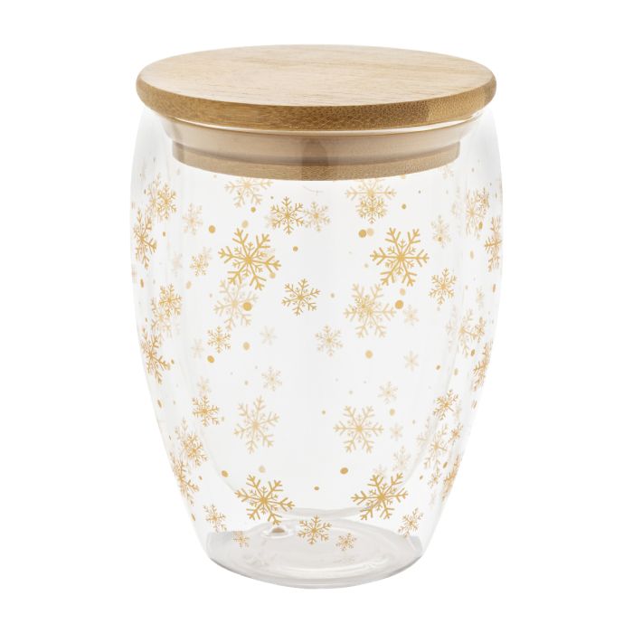 Duplafalú, boroszilikát üvegből készült thermo pohár karácsonyi hópehely mintával és bambusz fedéllel, 310 ml. Kraft papír dobozban.