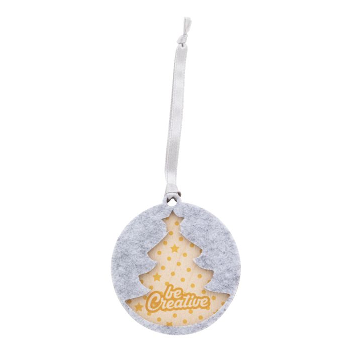 Egyedi gyártású, kétrétegű, RPET filcből és rétegelt nyírfából készült karácsonyfadísz ezüst szalaggal, a felső rétegén kivágott karácsonyi mintával. Az ár tartalmazza az UV LED nyomtatást az alsó rétegen. Minimális rendelési mennyiség: 100 db.