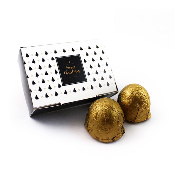 Marcipán ízű golyó (alkoholos töltelékkel) logózott dobozban, karácsony