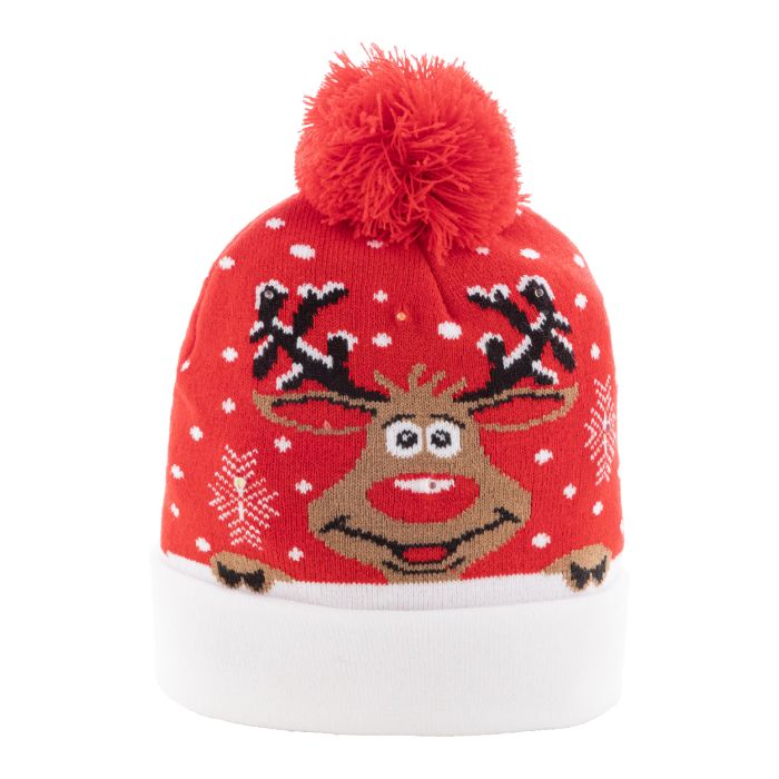 Kötött karácsonyi sapka akrilból, 6 LED fénnyel (3 világítási mód), mandzsettával és bojttal. Gombelemmel szállítjuk.
