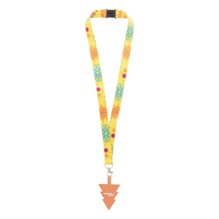 Egyedi gyártású RPET mobiltartós nyakpánt fém karabinerrel, biztonsági csattal és full colour nyomtatott, karácsonyfa alakú telefontartóval szakadásálló papírból. Mindkét oldalán szublimációs nyomtatással ellátva. Minimális rendelési mennyiség: 100 db.