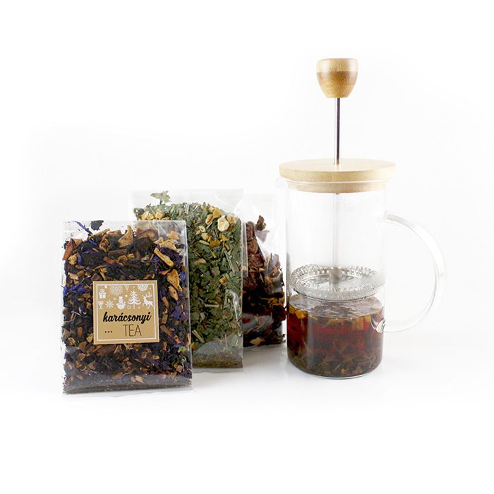 50 gr karácsonyi teakeverék, 40gr Reggeli ráhangolódás teakeverék zöld teával, 50gr Cseresznye ízű gyümölcstea, 350ml kávé és teafőző kancsó, arany díszdobozban masnival (230x170x80mm).