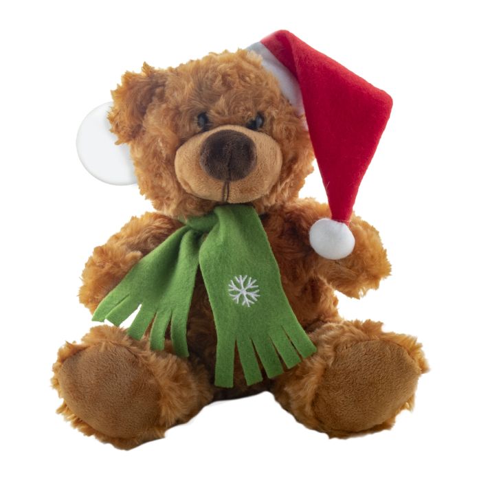 Plüssmackó Mikulás sapkával és sállal. Fülén emblémázható papír címkével.