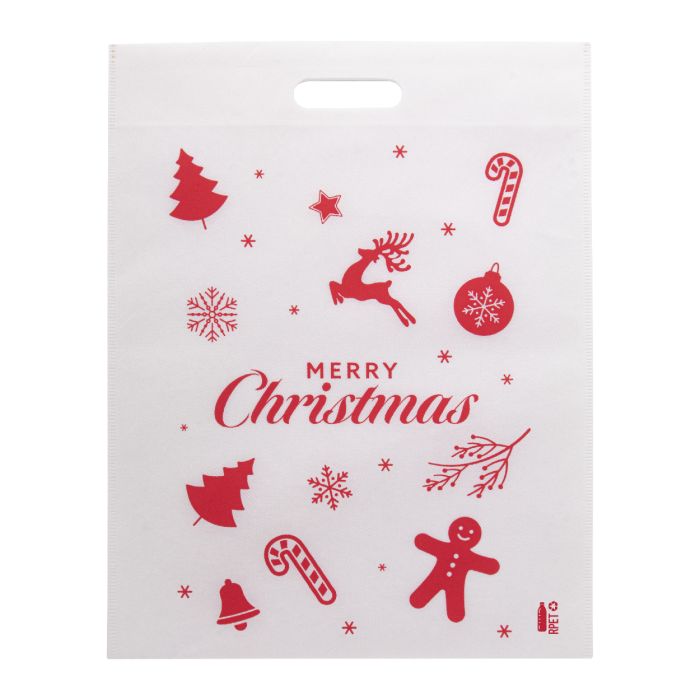 RPET non-woven bevásárlótáska karácsonyi mintával és kivágott hordfüllel, 80 g/m².