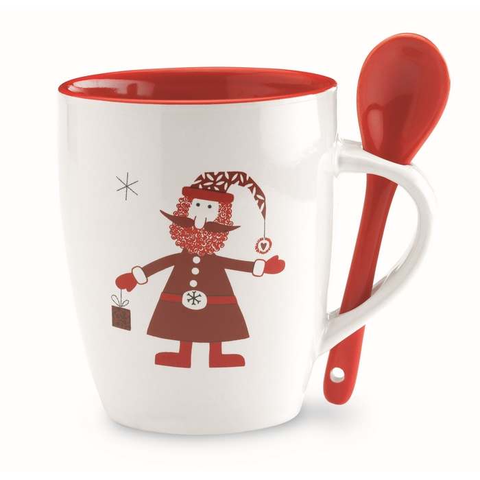 Kerámia kávésbögre kiskanállal, mikulás dekorációval, hozzáillő ajándékdobozban. 250ml.