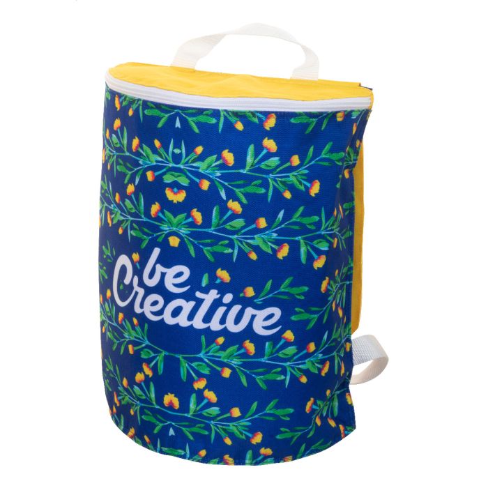 Egyedi gyártású cipzáras hűtőtka hátizsák 600D RPET poliészterből, alumínium béléssel és párnázott vállpántokkal. Teljes felületén szublimációs grafikával és megkülönböztető RPET címkével. Minimális rendelési mennyiség: 25 db.