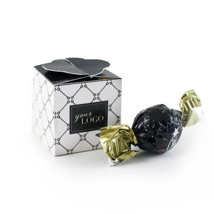 1 db mogyoró- vagy karamellás krémmel töltött tej- és étcsoki golyó, egyedi grafikás dobozban (40x40x40 mm).