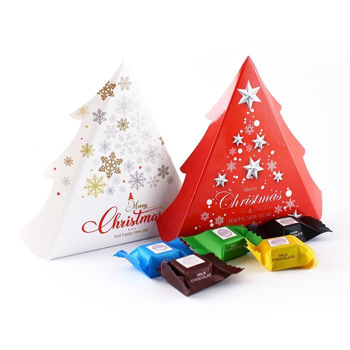 6 db vegyes ízesítésű (étcsoki, tejcsoki, mogyorós, robbanó cukorkás, epres, karamellás stb..), színes mini csoki kocka egyedi grafikás fenyőfa alakú dobozban (132x142x30mm).