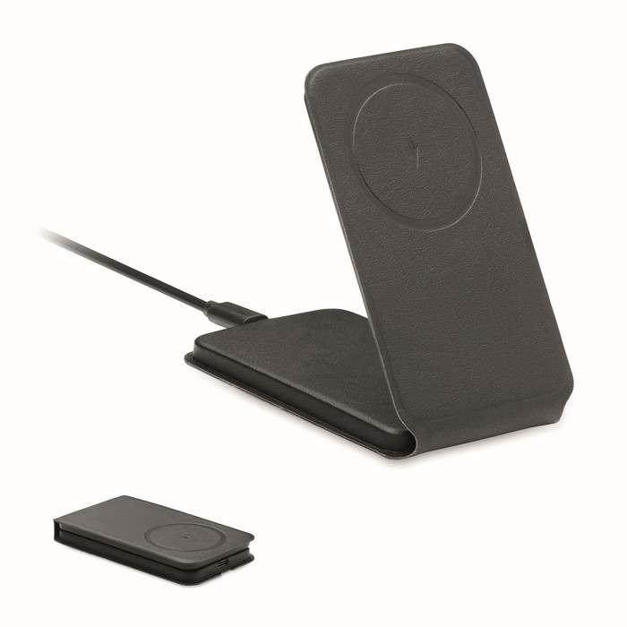 Összecsukható 15W vezeték nélküli töltő mágneses telefonállvánnyal, 58% újrahasznosított poliészterből és 42% PU-ból.