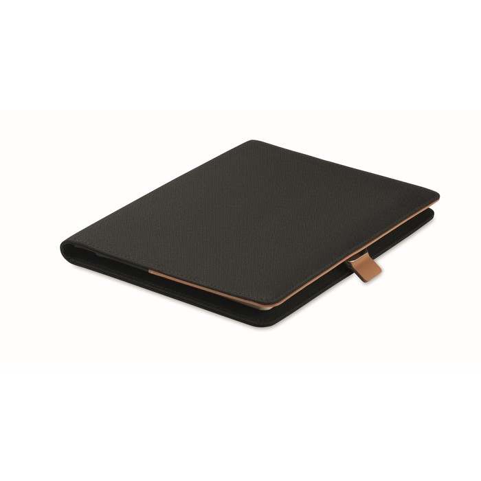 A5 iratmappa RPET anyagból, műbőr részletekkel. Cserélhető A5 jegyzetfüzet keménytáblás parafa borítóval. Cérnafűzött. 128 vonalas oldal (64 lap) újrahasznosított papírból. Tolltartó. 2 kártyatartó és egy nagy rekesz. Elasztikus zárópánt fém részlettel. FSC®-certified | FSC MIX, P8.6, FSC-C213206