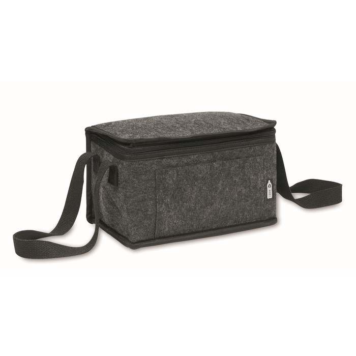 RPET filcből készült hűtőtáska elülső zsebbel. 1 mm vastag RPET filc és 3 mm vastag hőszigetelő laminált alumínium fólia. Kapacitás: 5 l.