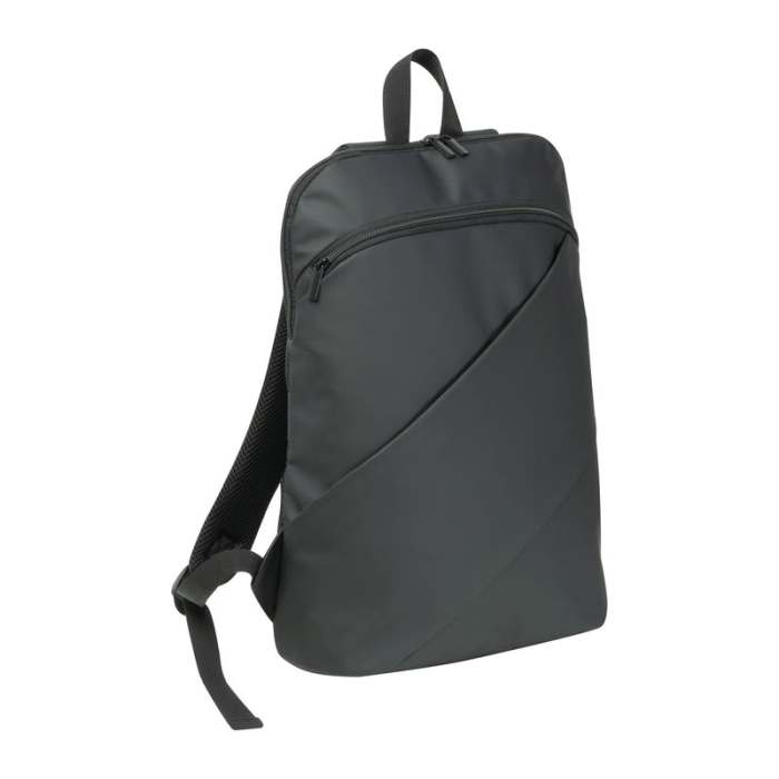 Műbőr hátizsák két ferde, fekete fényes cipzárral az elülső oldalon, hordozó füllel, két kényelmes vállpánttal és lopás elleni zsebbel.
