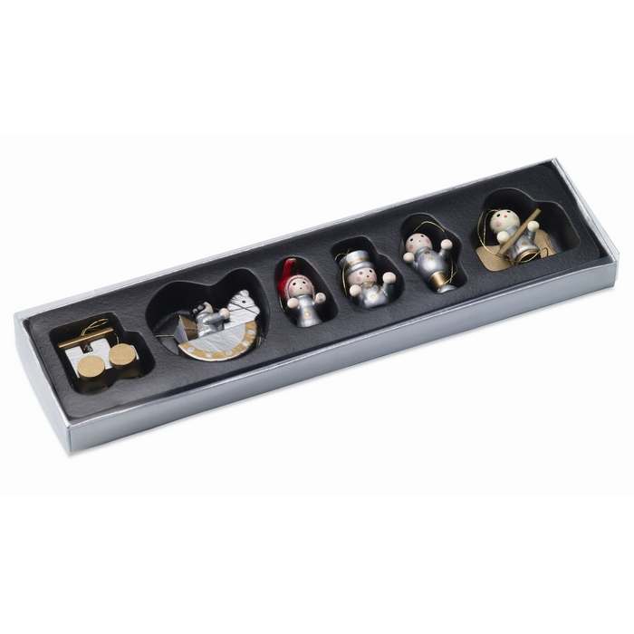 6 darabos fa karácsonyfadísz szett. Átlátszó fedelű kartondobozban.