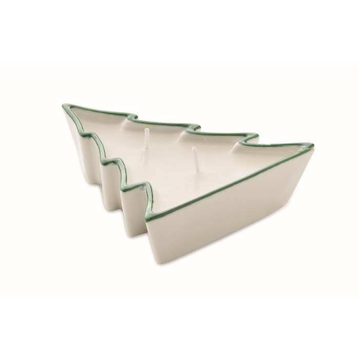 Növényi alapú viaszgyertya karácsonyfa alakú porcelán tartóban, 2 kanóccal. 60 g. Égési idő: 4 óra.