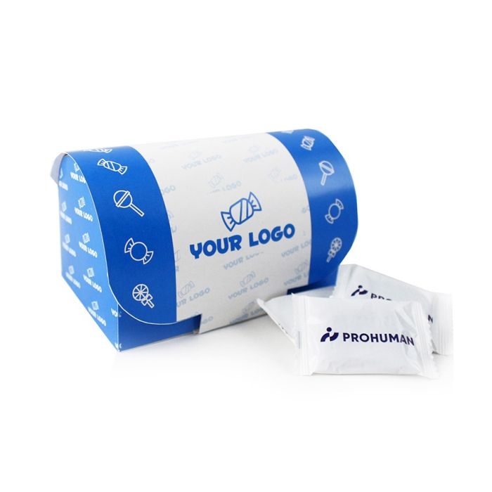 18 db 3gr ropogós kakaós keksz (egyesével 1 színnel egyedileg logózott fóliába csomagolva), egyedi grafikás ládikó dobozban (80x130x80mm).