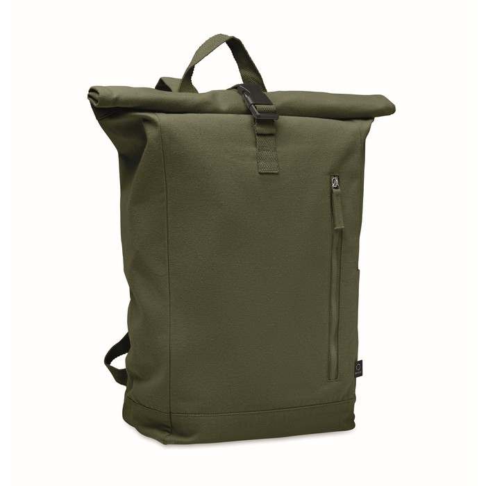 Rolltop csavart záródású hátizsák tépőzárral, 390 g/m² vastag újrahasznosított pamutból (80%) és újrahasznosított poliészterből (20%). Cipzáras elülső zsebbel.