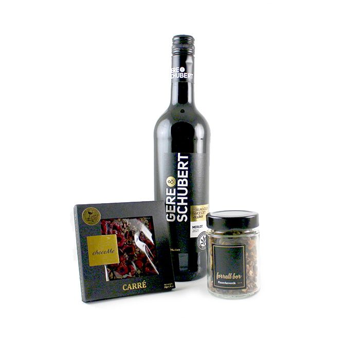 50gr exkluzív feltétes csokoládé Merlot borokhoz (Valrhona 66% étcsokoládé, Fahéj, Aprított kakaóbab, Liofilizált meggy darabkák, Vörösáfonya)0,75l Gere & Schubert Merlot, 70 gr forraltbor fűszerkeverék, arany vagy fehér díszdobozban (340x180x95mm).