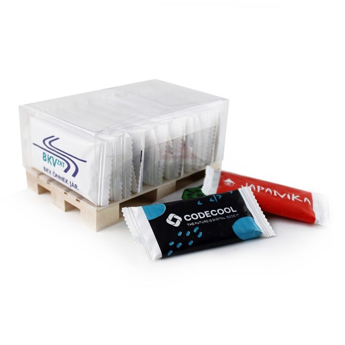 15 db 6gr ropogós karamellás keksz (egyesével 1 színnel egyedileg logózott fóliába csomagolva), mini fa raklapon (120x80x65mm).
