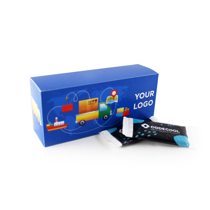 14 db 6gr ropogós karamellás keksz (egyesével 1 színnel egyedileg logózott fóliába csomagolva), egyedi grafikás dobozban (150 x 43 x 64 mm).