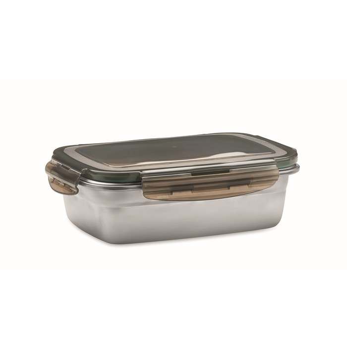 Újrahasznosított, rozsdamentes acél uzsonnásdoboz, PP fedéllel és 4 oldalas kattintós záródással. Űrtartalom: 850 ml.