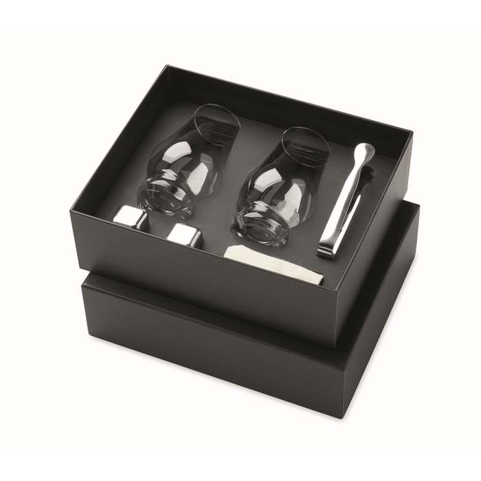 Készlet 2 kóstolópohárral (200 ml) whiskyhez vagy más szeszes italokhoz, 2 többször felhasználható rozsdamentes acél jégkockával, csipesszel és a jégkockák tárolására szolgáló pamut tasakkal. Ajándékdobozban.