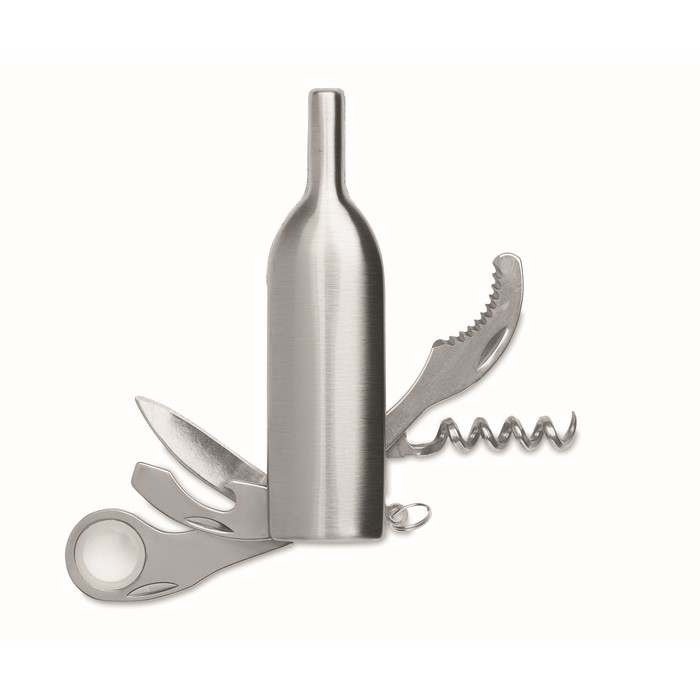 Borosüveg alakú, rozsdamentes acél zsebkés 6 funkcióval: üvegnyitó, kés, dugóhúzó, fóliavágó, nagyító és kulcstartó.