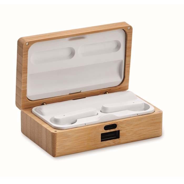 TWS fülhallgató mikrofonnal bambusz tokban. 1200 mAh vészhelyzeti powerbank külső akkumulátort tartalmaz C-típusú bemenettel, USB-A és C-típusú kimenettel. Automatikus párosítás.