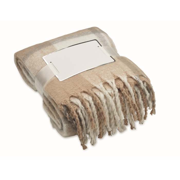 Kockás mintás mohair-RPET poliészter takaró sodort rojtokkal. Szalaggal átkötve, emblémázható kártyával szállítjuk.