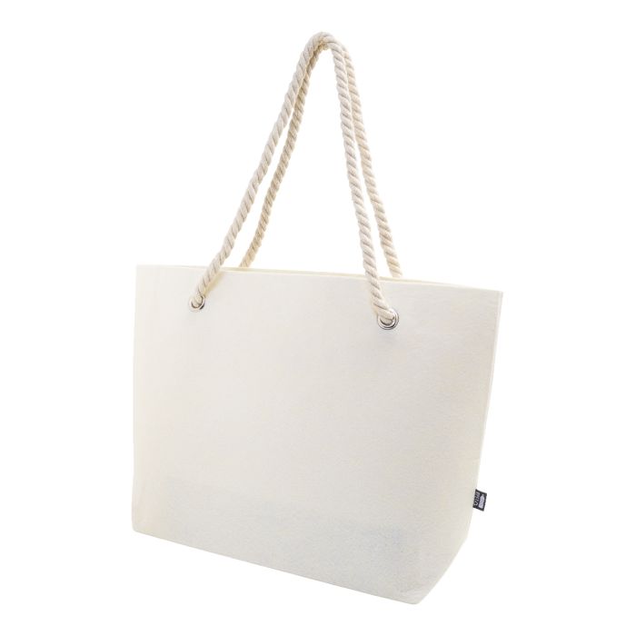 RPET filc strand- vagy bevásárlótáska pamut zsinóros fogantyúkkal és alsó betoldással. Megkülönböztető RPET címkével.