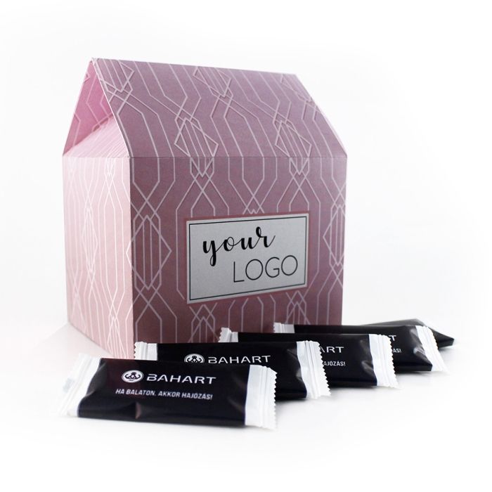 25 db 6gr ropogós karamellás keksz (egyesével 1 színnel egyedileg logózott fóliába csomagolva), egyedi grafikás házikó dobozban (170/100x130x100mm).