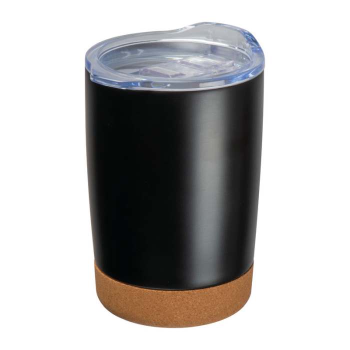 Duplafalú, vákuumszigetelt termoszbögre rozsdamentes acélból, 350 ml kapacitással és parafa alappal.