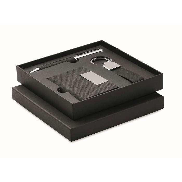 3 darabos ajándékkészlet díszdobozban. Tartalmaz egy csavarzáras fém golyóstollat RPET poliészter részletekkel, RPET poliészter kulcstartót és RPET poliészter kártyatartót fémlemezzel. Kéken író betéttel.