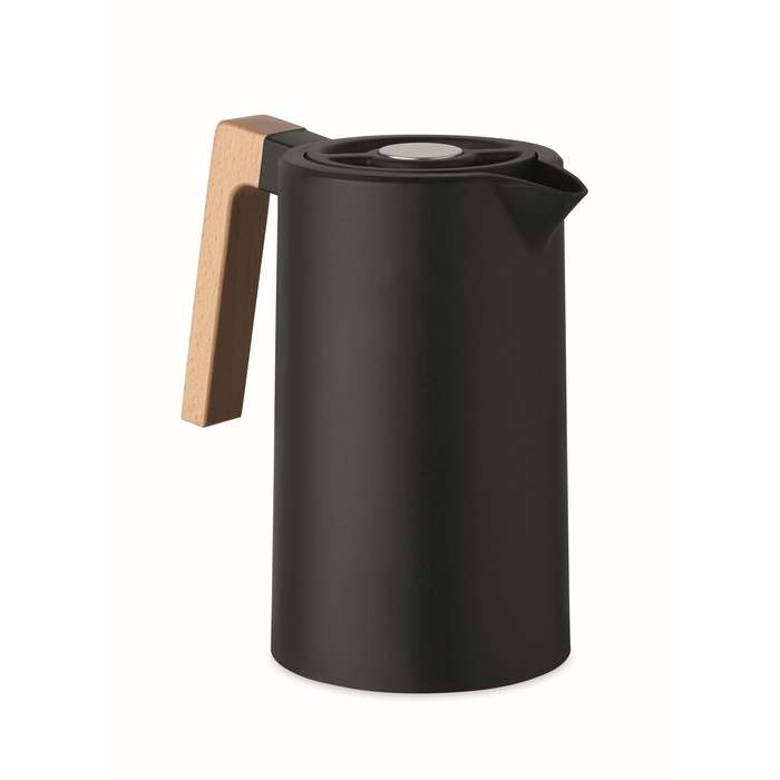 Duplafalú termoszkanna újrahasznosított rozsdamentes acél (90% újrahasznosított rozsdamentes acél és 10% rozsdamentes acél) belső és PP külső fallal, fa füllel. Űrtartalom: 1 liter.