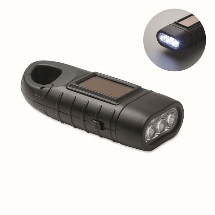 3 fehér LED-es, napelemmel és dinamóval is működő zseblámpa újrahasznosított ABS-ből.