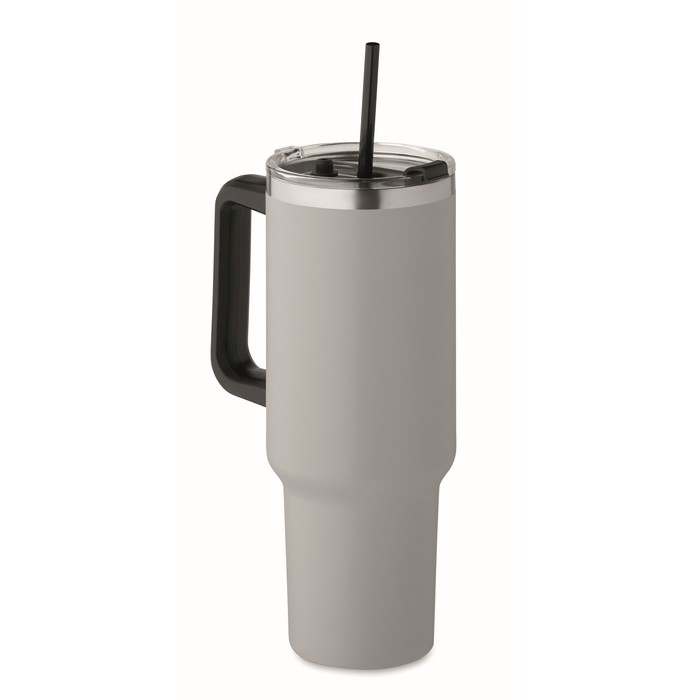 Duplafalú, újrahasznosított rozsdamentes acél pohár, beépített PE- szívószálas fedéllel. Űrtartalom 1200 ml. (90% újrahasznosított rozsdamentes acél és 10% rozsdamentes acél).