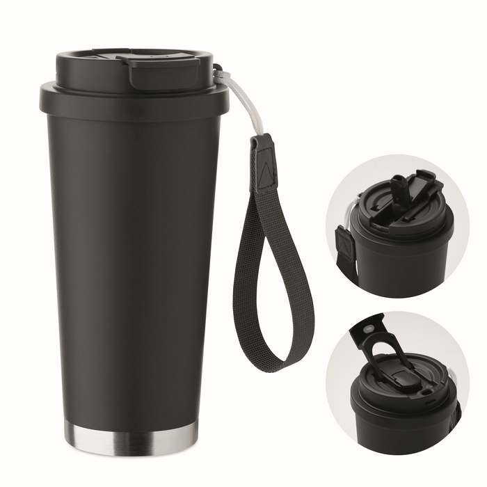 Duplafalú, újrahasznosított rozsdamentes acél (90% újrahasznosított rozsdamentes acél és 10% rozsdamentes acél) pohár, PP fedéllel (2 az 1-ben ivónyílással és szívószálas fedéllel) és RPET hordszíjjal. Szivárgásmentes. Űrtartalom: 500 ml.