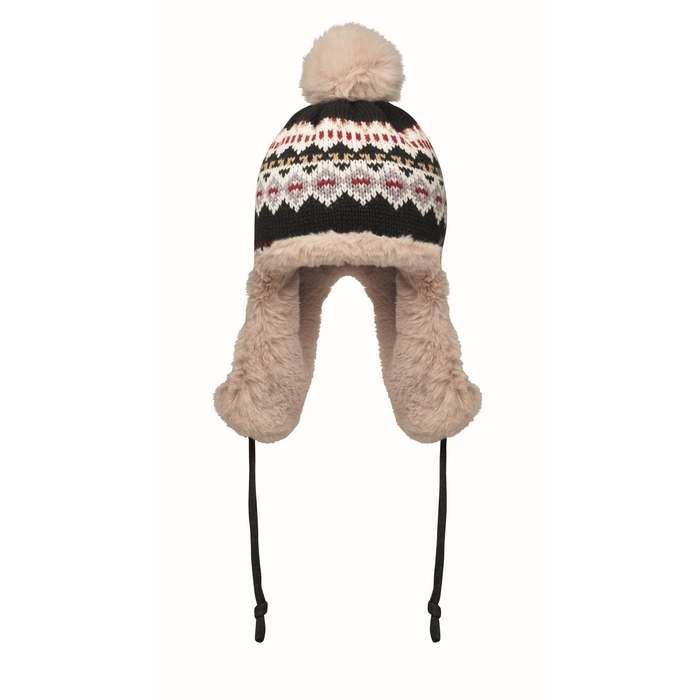 Akril kötött sapka fülvédővel és pomponnal, poliészter és polár béléssel. Egy oldalán emblémázható címkével. Felnőtt méret.
